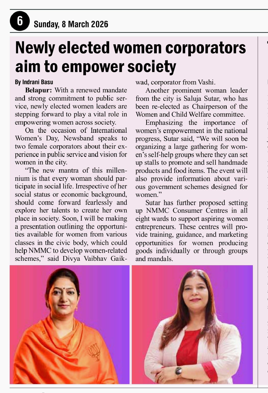 आंतरराष्ट्रीय महिला दिनाच्या पार्श्वभूमीवर, नवी मुंबईतील नव्याने निवडून आलेल्या महिला नगरसेवकांमध्ये दिव्या वैभव गायकवाड यांचे नाव विशेषत्वाने पुढे येते. समाजसेवेची ठाम भूमिका आणि महिलांच्या सर्वांगीण विकासासाठीची त्यांची बांधिलकी स्पष्टपणे दिसून येते. त्यांच्या मते, प्रत्येक महिलेला सामाजिक जीवनात सक्रिय सहभाग घेण्याची संधी मिळाली पाहिजे. सामाजिक किंवा आर्थिक पार्श्वभूमी काहीही असो, महिलांनी निर्भयपणे पुढे येत आपली क्षमता ओळखून स्वतःचे स्थान निर्माण करणे आवश्यक आहे.