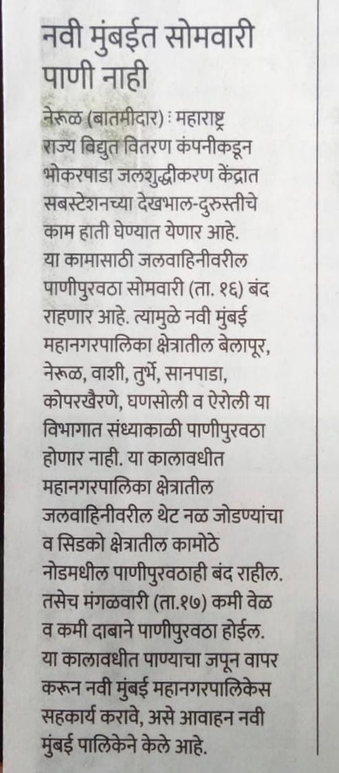 As per information given by NMMC WATER SUPPLY Department Shutdown will be taken by MSEB of Substation at Bhokarpada Area near Morbe Dam, due to which No water supply on Monday 16.03.2020 in Vashi, Belapur, Nerul, Turbe, Sanpada, Ghansoli & Airoli.