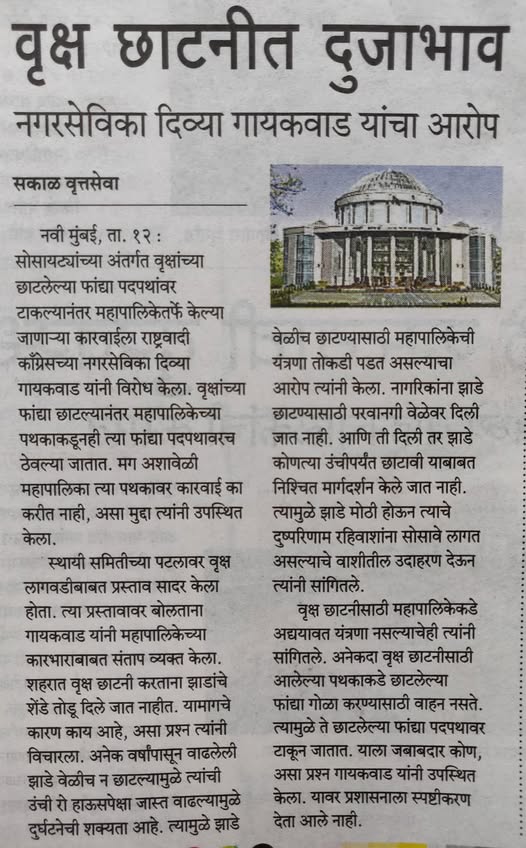 Corporator Divya Vaibhav Gaikwad slams NMMC administration over tree trimming across the city.