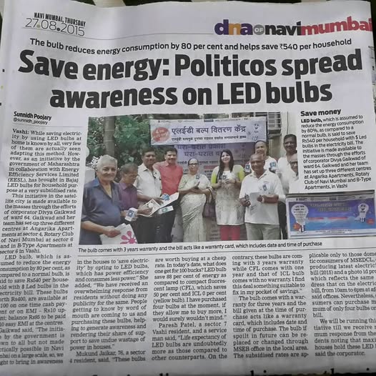 A big thank you to DNA news paper for publishing Save Energy article. This article will help in bringing more awareness among residents to use LED BULBS AND SAVE POWER.