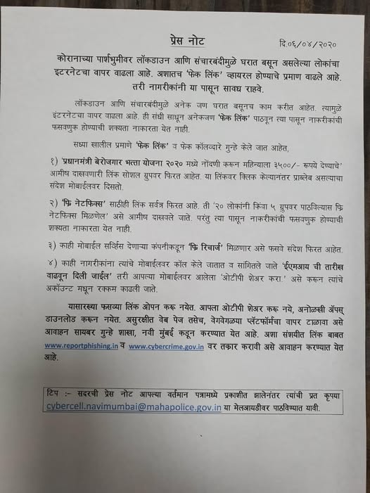 The Cyber Crime Branch Navi Mumbai is appealing for unsafe web pages as well as the use of various platforms.