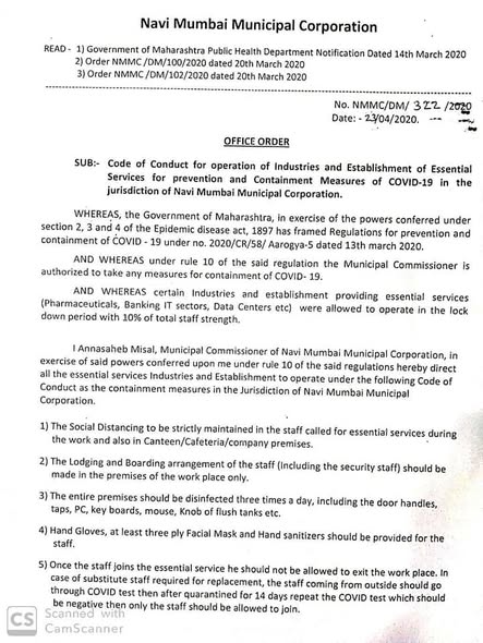 #NMMC Code of Conduct for Operation of Industries & Establishment of Essential Services for prevention & containment measures of #Covid_19 in Navi Mumbai.