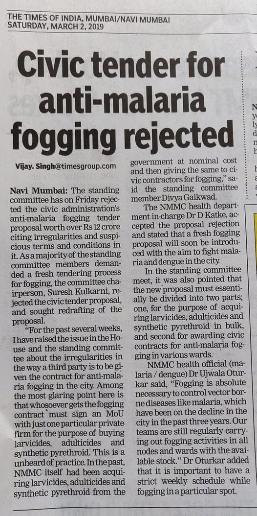 I would like to inform you that, I had opposed the proposal in NMMC Standing Committee meeting of Larvicides, Adulticides & Synthetic Pyrethroid (Chemical/Medicine used for Fumegation to reduce mosquito) to be purchased by the Contractor who does the Fumegation work. The proposal after my oppose was supported by all members was rejected.