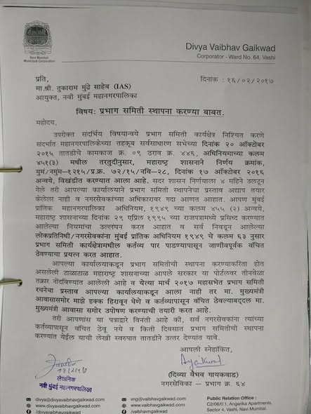 Divya Gaikwad – Corporator Ward 64 continues her fight for Corporator’s rights for forming Ward Committees with Commissioner, NMMC, who has blocked the legally applicable rights of each corporator from development of his or her Ward.