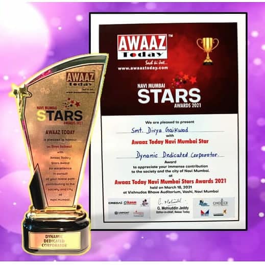 Pleasure to share with you AWAAZ TODAY NAVI MUMBAI STAR bestowed on me on your behalf for Dynamic Dedicated Corporator at AWAAZ TODAY NAVI MUMBAI STARS AWARDS 2021 held on March 18, 2021. Achieving this award would not have been possible without your sincere support & encouragement. My heartfelt thanks to all my ward members & the organizers Awaaz Today. #divyavaibhavgaikwad