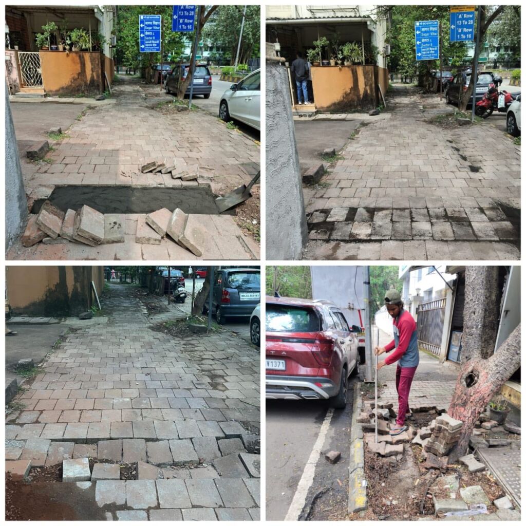NMMC has now started the repair and leveling work on these uneven footpaths. The damaged sections are being fixed sector-wise to ensure smooth pedestrian movement and improved safety.