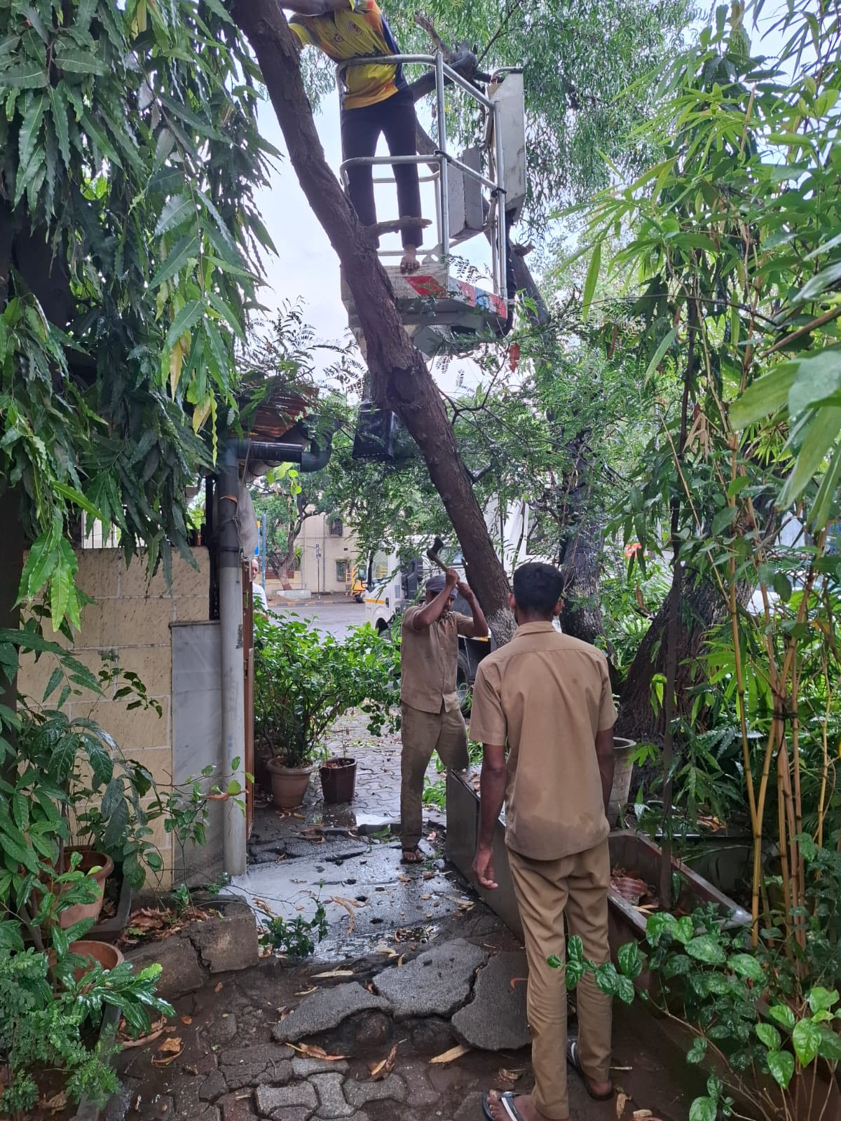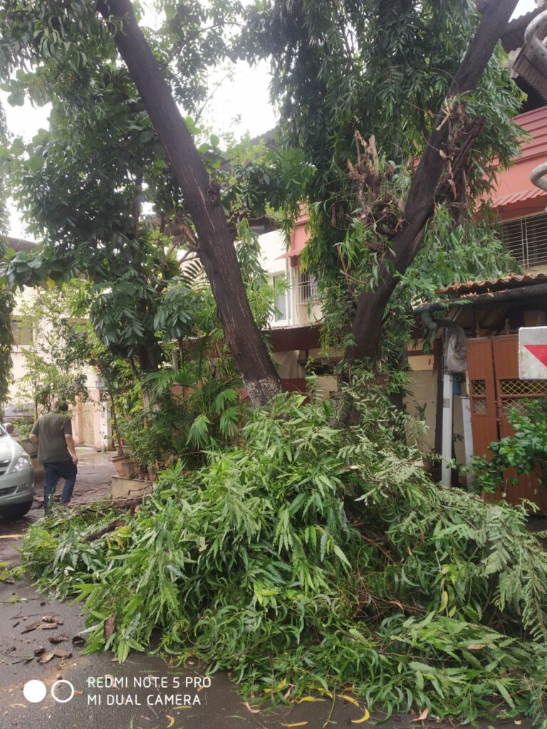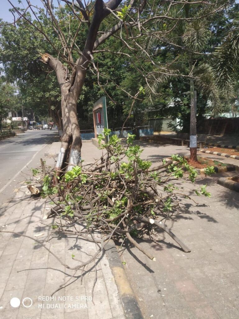 Based on complaints received from citizens, a request was made to NMMC to trim the roadside trees that had grown excessively tall and posed a danger to houses along the road. The trimming work is now in progress to ensure safety for residents. We request everyone to kindly bear with the temporary inconvenience caused during this essential maintenance activity.