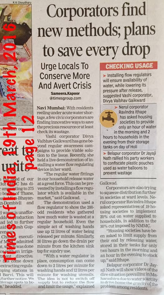 Today’s Times of India page 12, Artical on save water by Sameera. Kapoor. Thanks to Times of India and Sameera for this report on save water.