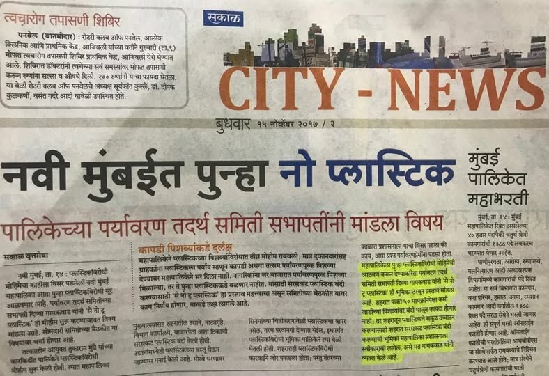 Community InitiativesSAY NO TO PLASTICByDivya Vaibhav GaikwadNovember 15, 20170Comments Grateful to share this update with our community. #Today’s Article in THE SAKAL news paper. “SAY NO TO PLASTIC”