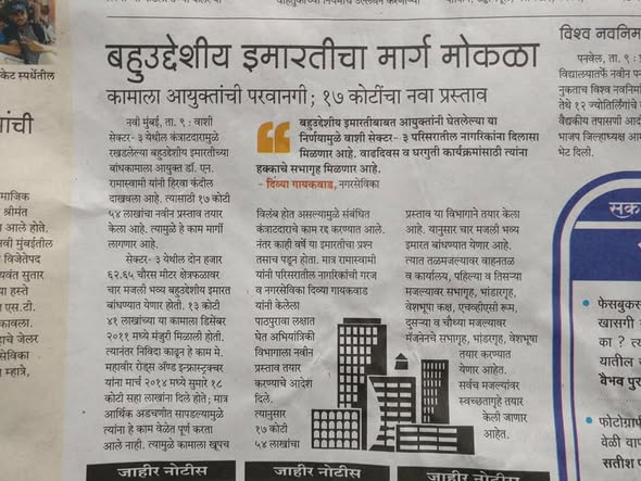 Civic Work UpdatesUpcoming project in ward 64, vashi.ByDivya Vaibhav GaikwadApril 11, 20180Comments Grateful to share this update with our community. Upcoming project in Ward 64, Vashi.