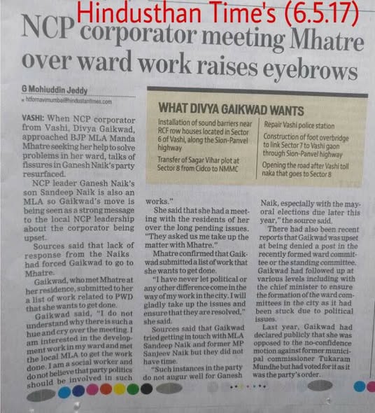 Watch “NCP Corporator Divya Gaikwad seeks Belapur MLA Manda Mhatre’s help for ward works” on YouTube